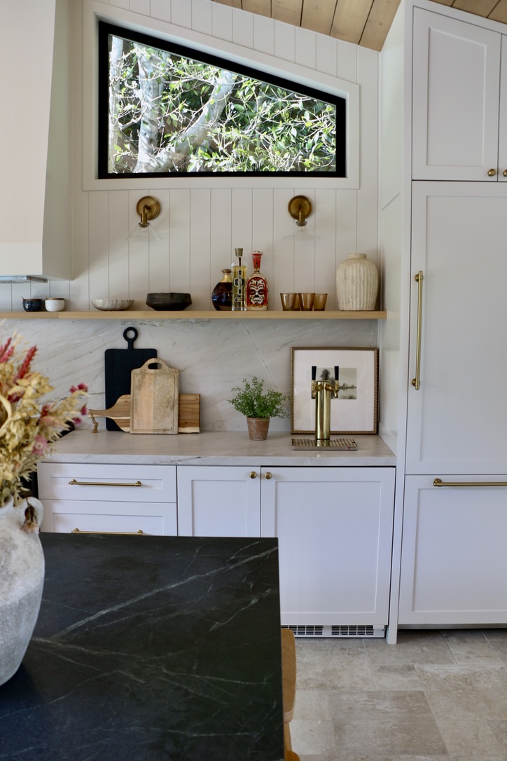 The entire build is an open layout since it was built as an entertaining space, so it was really important to me that the kitchen blended nicely with the look and feel of the entire space. I added a shelf on top of the quartzite backsplash to display everyday items and art, which IMO makes it prettier (and more interesting) to look at. The shelf is white oak instead of fabricating a quartzite shelf – it adds warmth to the space and was friendlier to the budget. The back counter and backsplash are quartzite, while the island countertop is soapstone—a last-minute pivot that happened when the client and I spotted the perfect slab and fell in love. Sometimes, the best design decisions are the spontaneous ones.