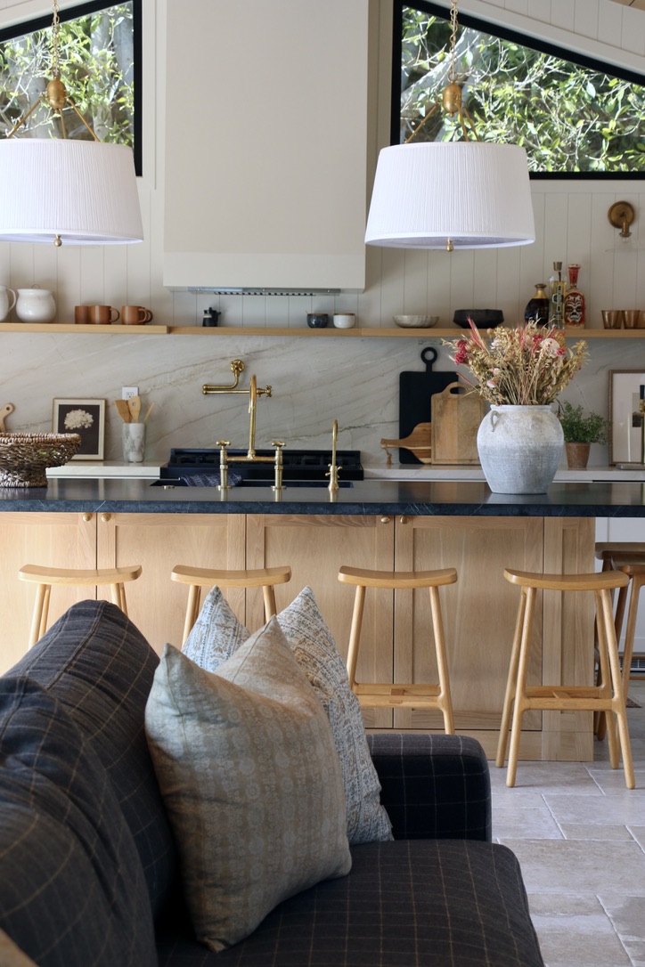 The entire build is an open layout since it was built as an entertaining space, so it was really important to me that the kitchen blended nicely with the look and feel of the entire space. I added a shelf on top of the quartzite backsplash to display everyday items and art, which IMO makes it prettier (and more interesting) to look at. The shelf is white oak instead of fabricating a quartzite shelf – it adds warmth to the space and was friendlier to the budget. The back counter and backsplash are quartzite, while the island countertop is soapstone—a last-minute pivot that happened when the client and I spotted the perfect slab and fell in love. Sometimes, the best design decisions are the spontaneous ones.