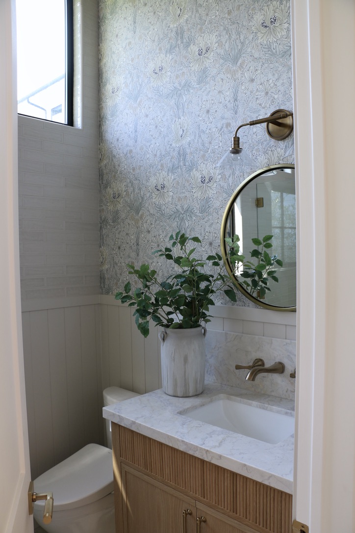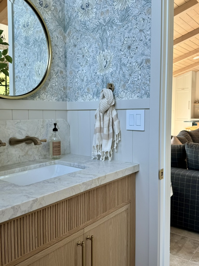 Wallpaper and wall molding add warmth and personality, elevating the room so it feels intentional and designed rather than purely functional. This bathroom proves that even in a compact ADU, it’s possible to incorporate laundry, storage, and style seamlessly.